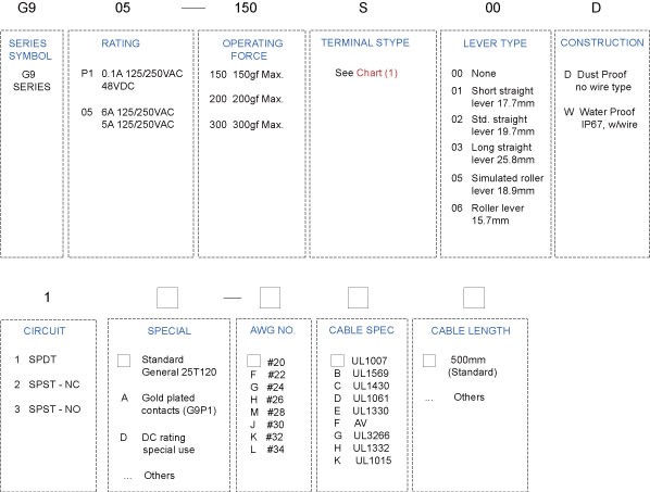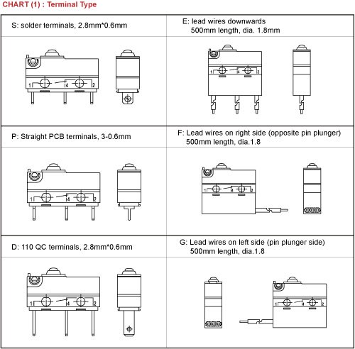 • Safety approved internationally by cURus in North America, Nemko ENEC in Europe, CQC in Asia • Wire type is with IP67 protection level (Nemko ENEC17, CQC), terminal type is without waterproof. • SPST-NC, SPST-NO or SPDT • Wide range of wiring terminals and levers • With or without posts, left side or right side posts • Applications in automotive electronics, appliance and Industrial control