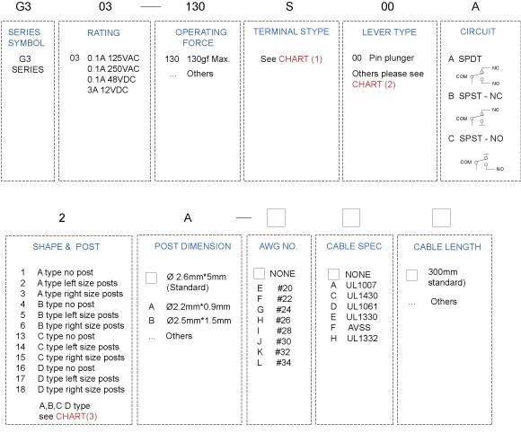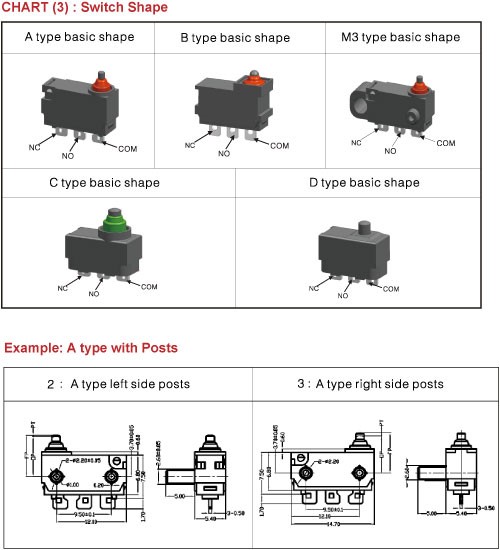 • Safety approved internationally by cURus in North America, Nemko ENEC in Europe, CQC in Asia • IP67 protection level for wire type (Nemko ENEC17, CQC) • SPST-NC, SPST-NO or SPDT • Wide range of wiring terminals and levers • With or without posts, left side or right side posts • Applications in automotive electronics, appliance and Industrial control Specification: • 0.1A 125/250VAC 48VDC, 3A 12VDC (cURus) • 0.1A 125/250VAC 48VDC, 3A 12VDC μ40T85 1E5 (Nemko ENEC17, CQC) • Initial contact resistance : 100m ohms MAX. (without wire type) • Insulation resistance : 100M ohm MIN. at 500VDC • Dielectric strength : 500VAC (50~60Hz) • Electrical life : 6,000 cycles