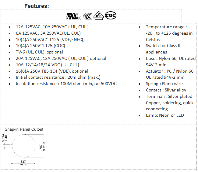 - Product description: MR2-R dia. 20mm, 16(8)A~250VAC, TV6