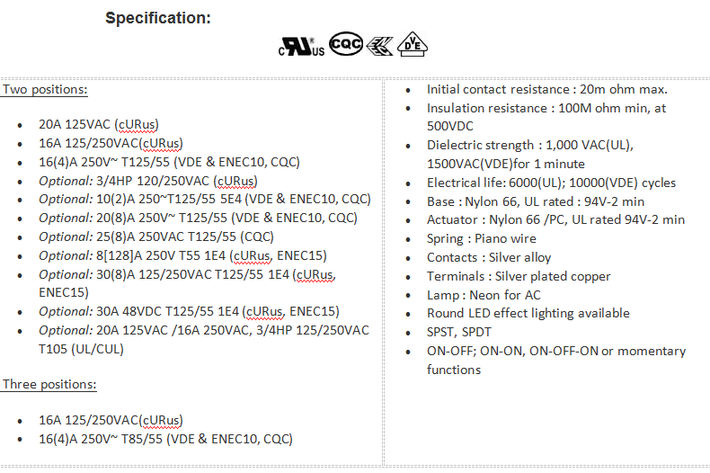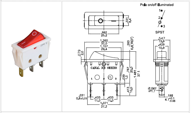 Standard 11x30mm rocker switches, up to 30A 125/250VAC, 128 inrush
