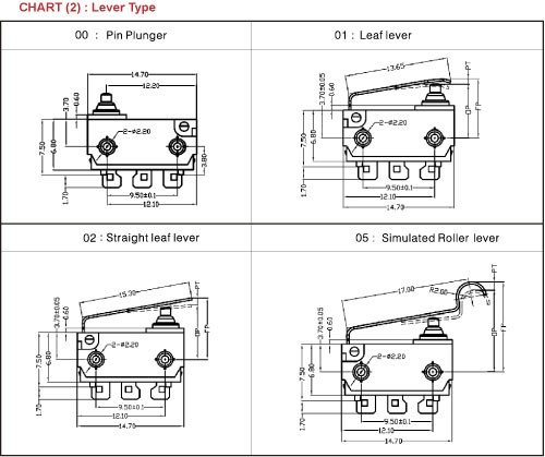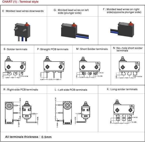 • Safety approved internationally by cURus in North America, Nemko ENEC in Europe, CQC in Asia • IP67 protection level for wire type (Nemko ENEC17, CQC) • SPST-NC, SPST-NO or SPDT • Wide range of wiring terminals and levers • With or without posts, left side or right side posts • Applications in automotive electronics, appliance and Industrial control Specification: • 0.1A 125/250VAC 48VDC, 3A 12VDC (cURus) • 0.1A 125/250VAC 48VDC, 3A 12VDC μ40T85 1E5 (Nemko ENEC17, CQC) • Initial contact resistance : 100m ohms MAX. (without wire type) • Insulation resistance : 100M ohm MIN. at 500VDC • Dielectric strength : 500VAC (50~60Hz) • Electrical life : 6,000 cycles |